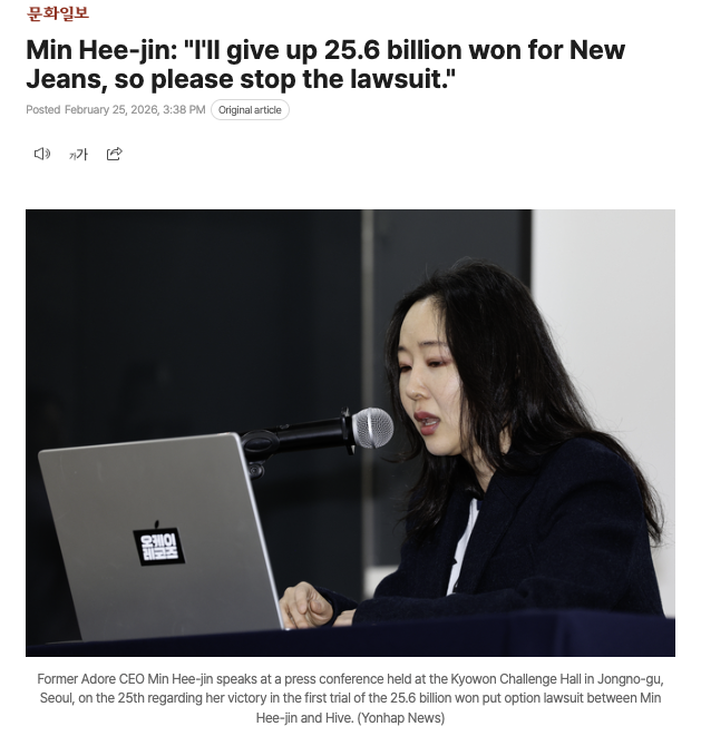 Among all the reasons behind this decision, the most urgent is the NewJeans members. In exchange for setting aside the 25.6 billion won, I propose that all ongoing civil and criminal lawsuits be immediately halted and all disputes brought to an end. This proposal includes not only matters concerning me personally, but also the termination of all complaints and legal actions involving the NewJeans members, outsourced partner companies, former ADOR employees, and even members of the fandom who were hurt after becoming entangled in this conflict.